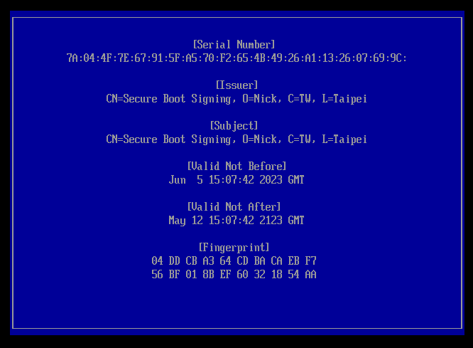 Subject: C=TW, L=Taipei, O=Nick, CN=Secure Boot Signing/emailAddress=[email protected]
